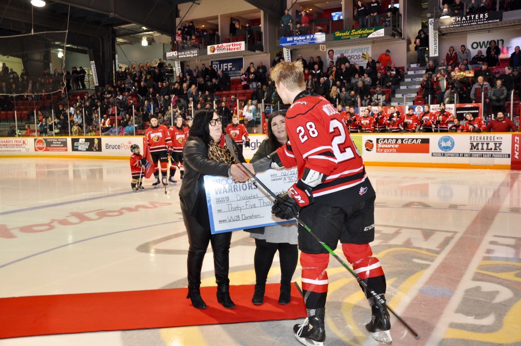 On Saturday, February 22, prior to the Owen Sound Attack facing off against the Erie Otters, Mark Woolley proudly presented Diabetes Canada with a $35,000 cheque, raised through his efforts in just six months with Woolley’s Warriors (WW28). The donation will help send kids to Diabetes Canada D-Camps this summer.